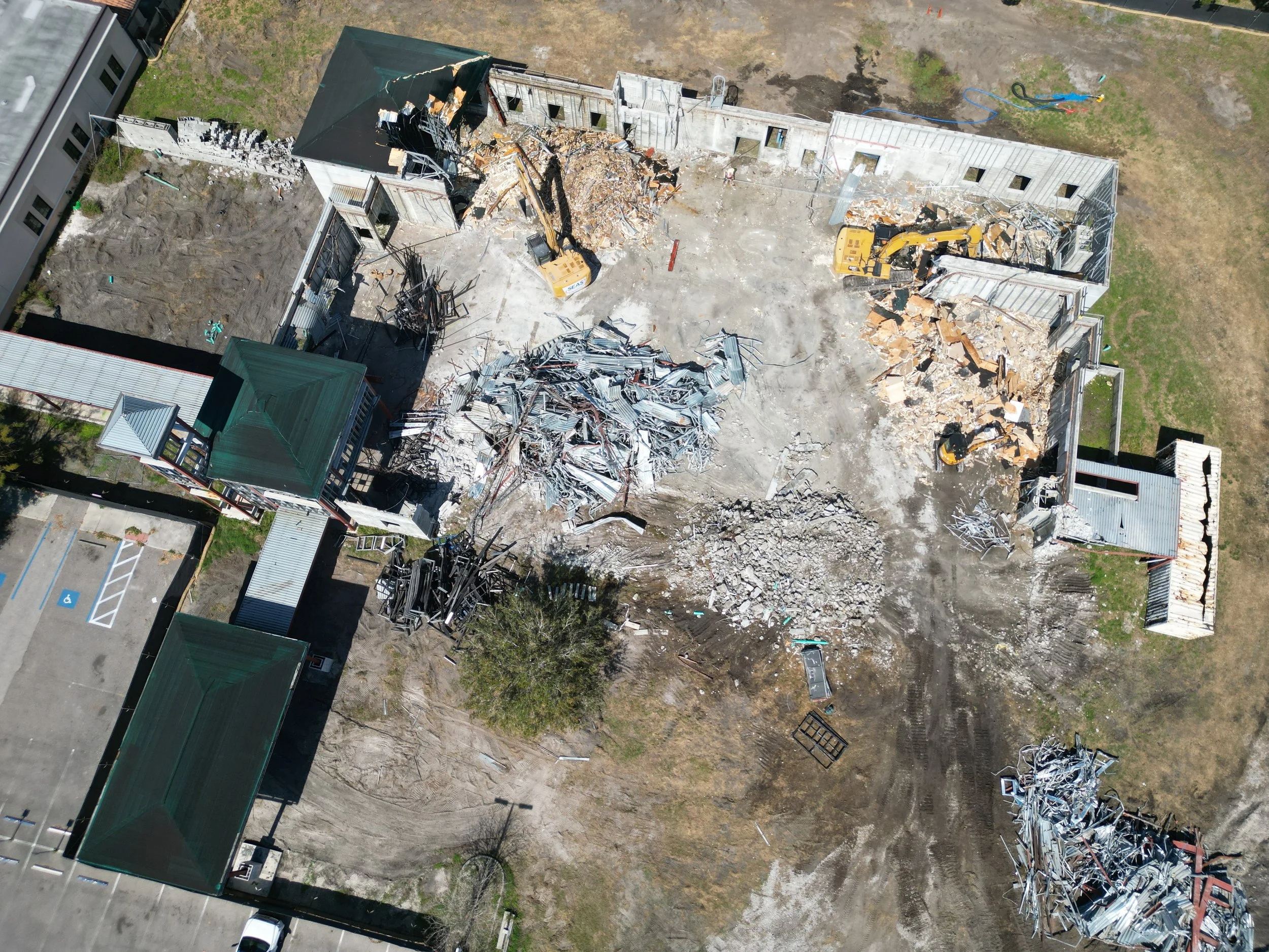 After assuming control of the contract, Diversified faced the challenge of an overgrown site at the unfinished CITC building, which needed to be landscaped before demolition and plumbing work could commence. Additionally, daily dewatering operations were necessary at the tie-in locations. Once the water tie-ins were completed, the Diversified team could initiate the demolition of the unfinished CITC structure. However, this task required careful coordination with the VA staff due to its adjacency to the Radiology Oncology Clinic. To ensure uninterrupted patient care at the ROC, off-hours demolition was essential to prevent vibrations from affecting ongoing treatments. We were able to finish the project within six weeks, beating the allowed period of performance by 4.5 months.